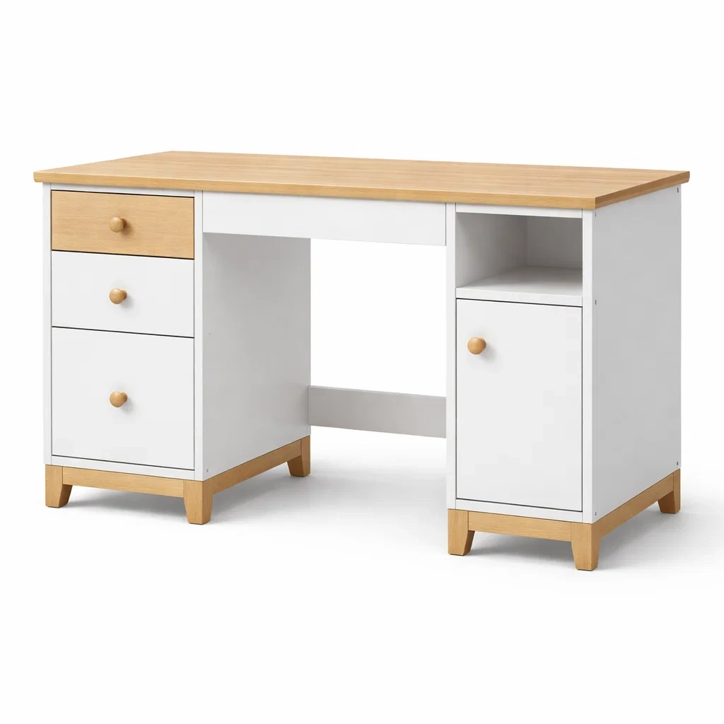 Bureau en mdf blanc et bois avec tiroirs et placard bureau