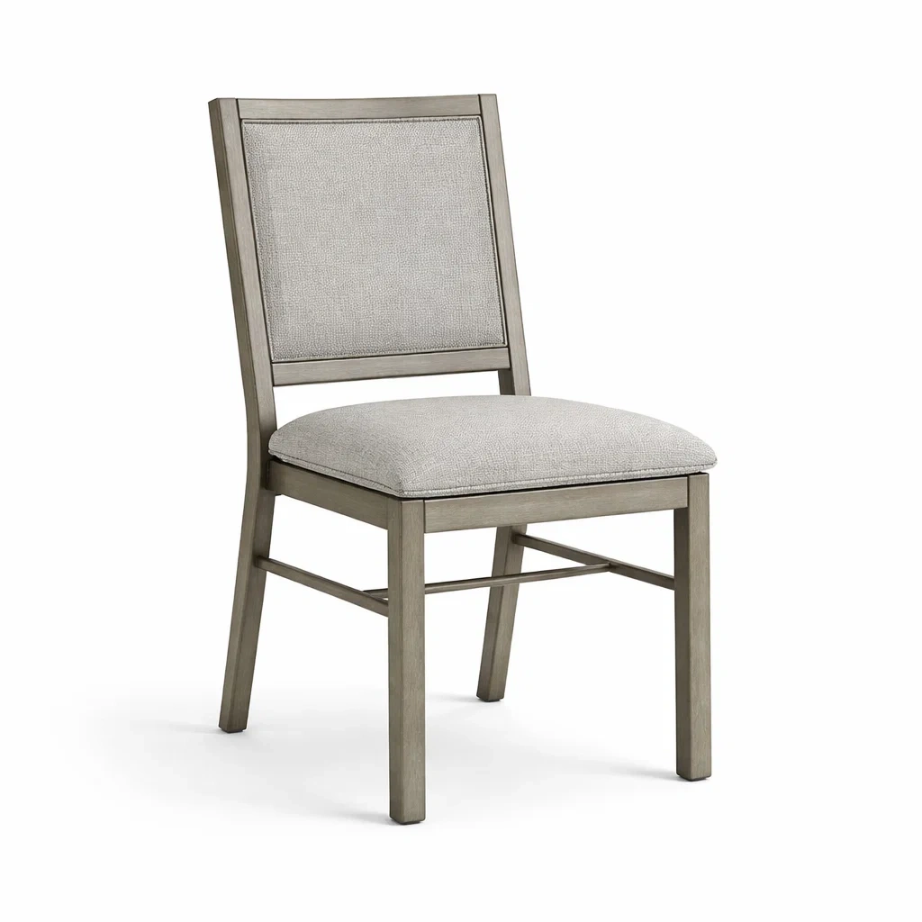 Chaise en bois avec une assise et un dossier en tissu polyester gris. Dimensions : hauteur 90 cm, largeur 45 cm, profondeur 55 cm. Poids : 5.5 kg. Capacité de charge maximale : 120 kg.