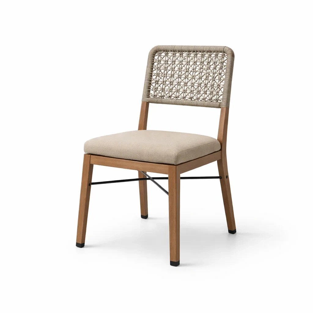 Cette chaise dispose d'un cadre en bois massif, d'un dossier en corde tressée et d'un coussin en tissu polyester. Elle est adaptée pour une utilisation en intérieur. Le cadre est renforcé par des barres en métal peinte. Poids maximum supporté : 100 kg.