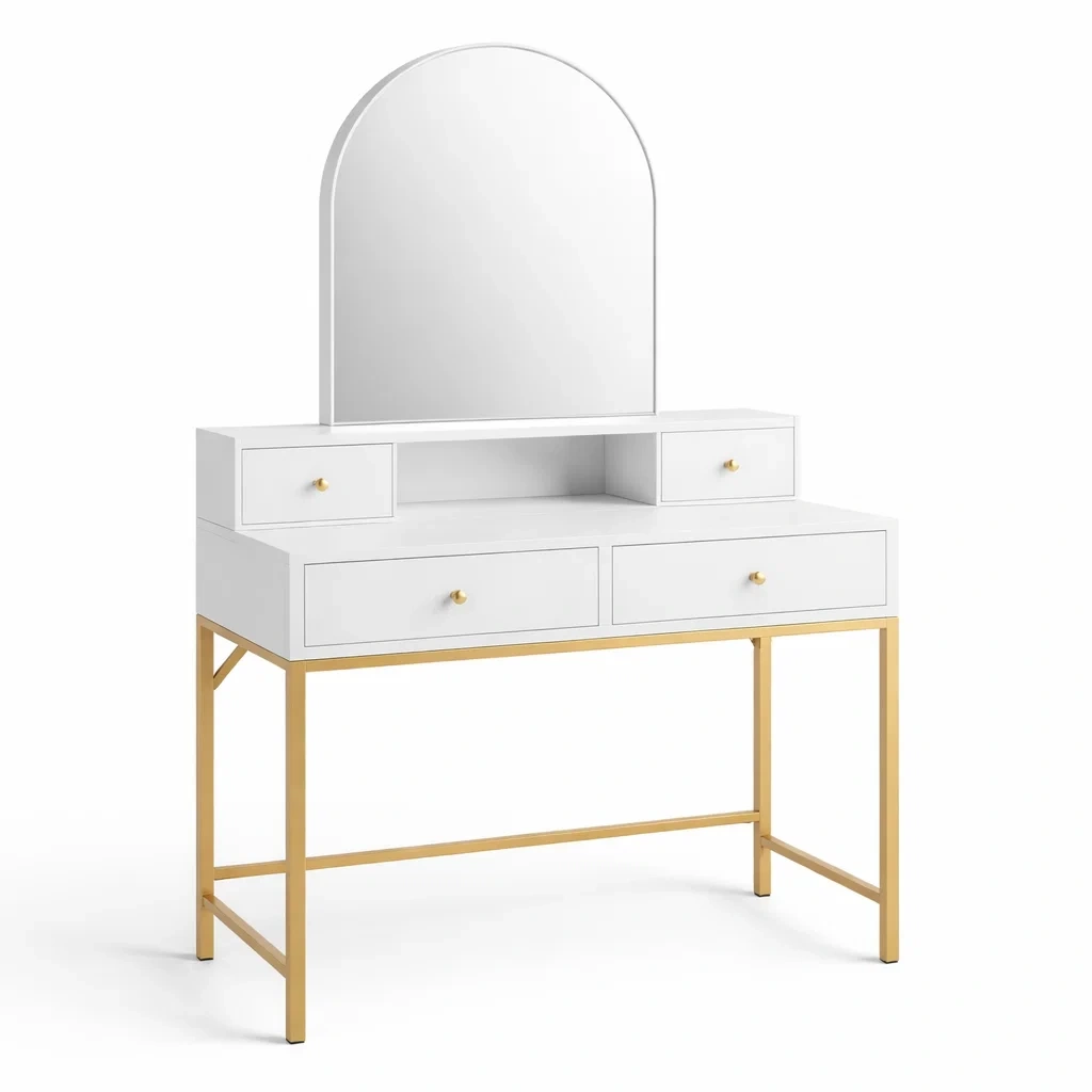 La coiffeuse est fabriquée en MDF avec une finition laquée blanche. Les pieds sont en métal doré.