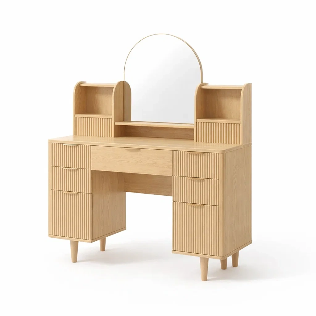 Caractéristiques: Miroir demi-circulaire, deux étagères ouvertes, six tiroirs