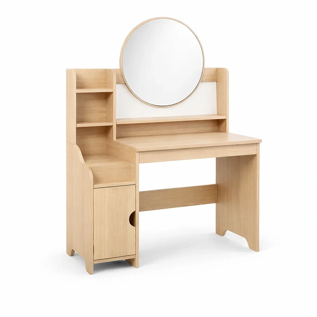 Fonction : Coiffeuse avec miroir rond et espace de rangement.