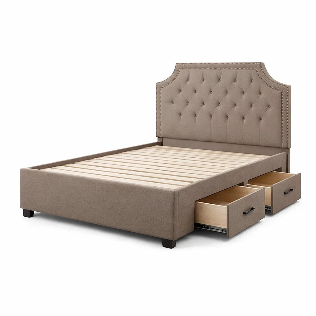Le lit est composé d'une structure en bois massif recouverte d'un tissu en polyester de couleur beige. La tête de lit est capitonnée et intègre deux tiroirs pour un rangement pratique.