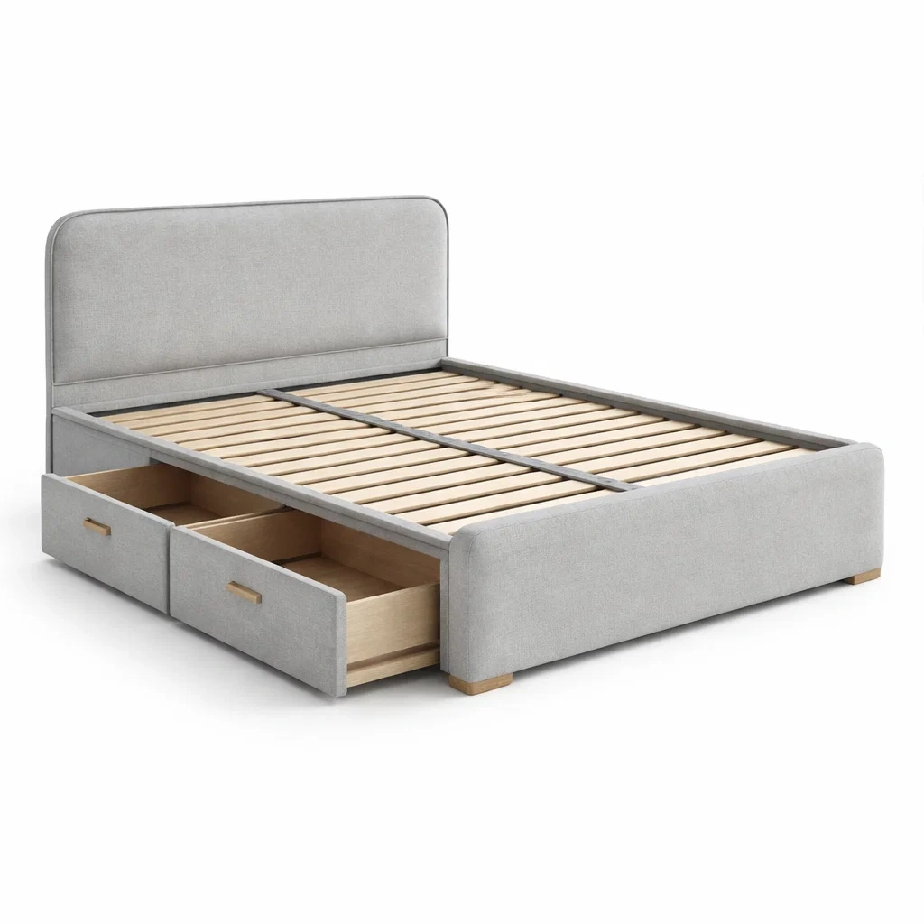 Il est équipé d'un sommier à lattes en bois et de deux tiroirs de rangement intégrés en bois. La tête de lit est rembourrée pour un confort accru.