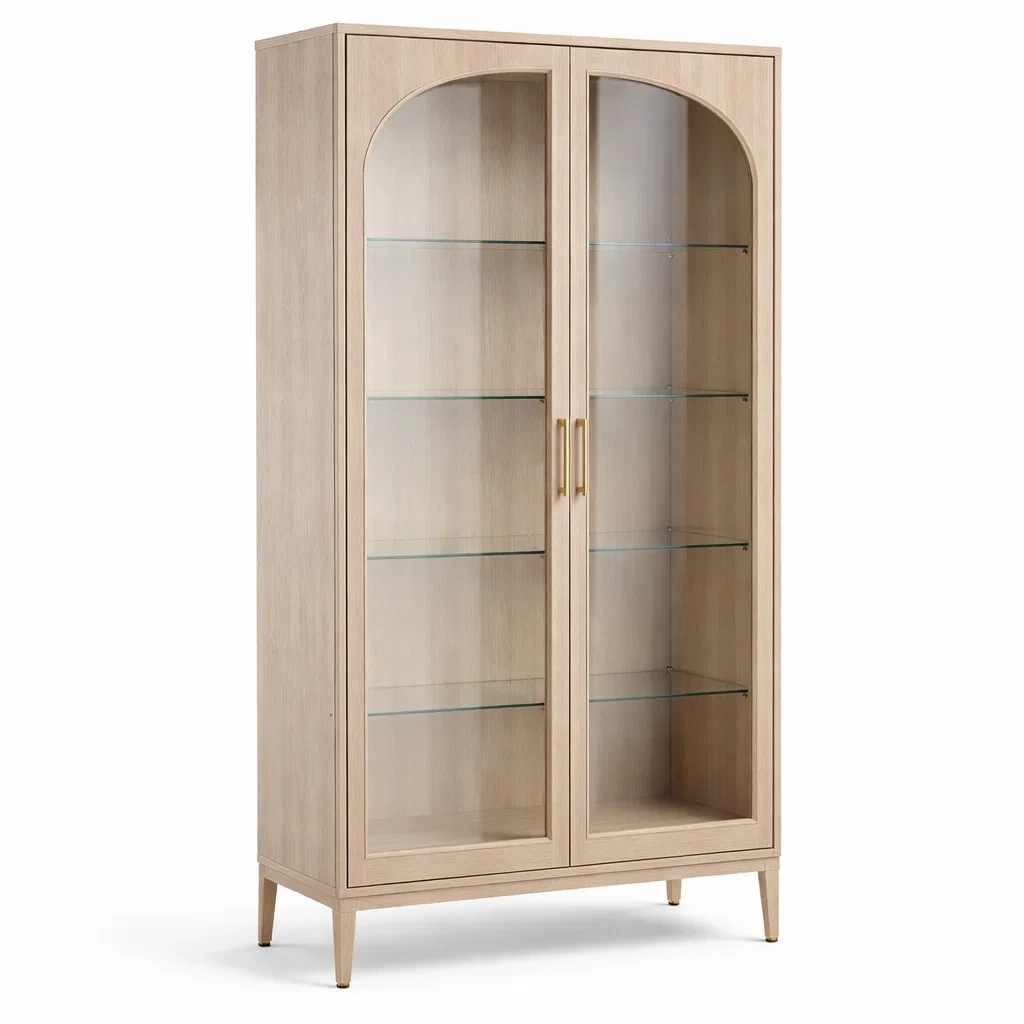 Cette vitrine est fabriquée en bois de chêne avec des portes et étagères en verre trempé de 5 mm pour une présentation élégante.